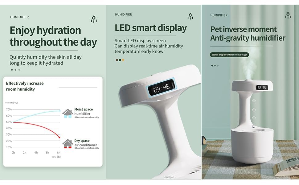 - Anti-Gravity Water Flow with Smart LED Clock Display: cool mist humidifier for room Bring the ultimate relaxing experience at home with the cool mist . Its anti-gravity water flow technology creates the illusion of backflow droplets and a soothing running water white noise. The room humidifier also features a smart LED display to track time and a warm light for the perfect mood lighting